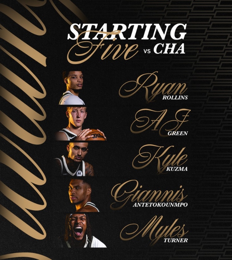 Đội hình xuất phát của Bucks: Myles Turner, Antetokounmpo, Kuzma, AJ Green, Ryan Rollins.