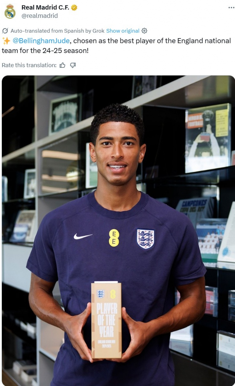 Bellingham được bầu làm cầu thủ đội trưởng thành nam của đội tuyển Anh trong mùa giải 24/25 và chương trình khuyến mãi chính thức của Real Madrid cũng đăng ảnh để chúc mừng anh ấy.