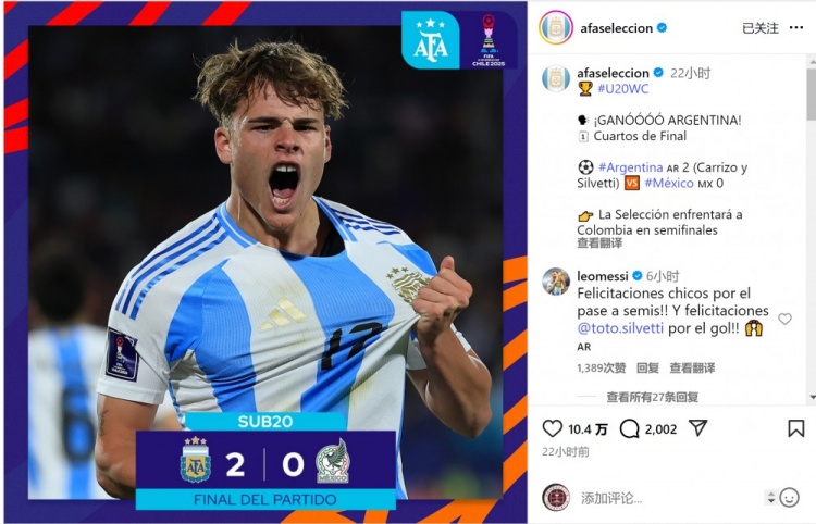 Tin nhắn trên mạng xã hội của Messi: Chúc mừng Argentina đã tiến vào bán kết Giải vô địch trẻ thế giới và chúc mừng Silveti vì đã ghi bàn thắng