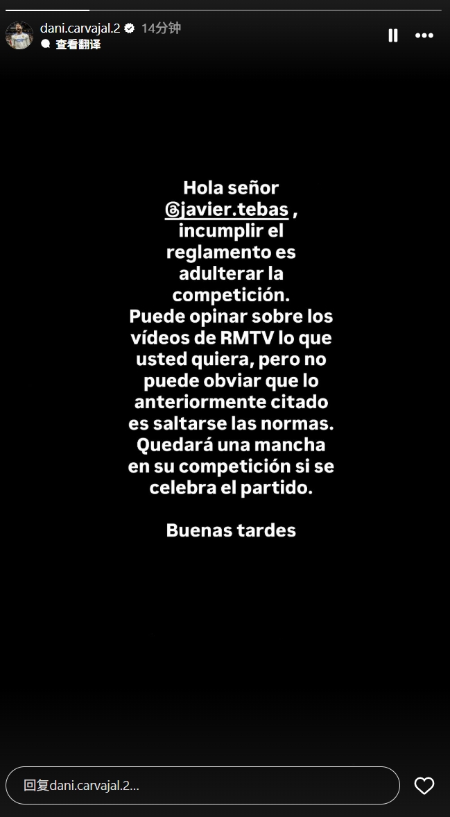 Carvajal đã đăng một trạng thái trên IG để phản hồi lại những nhận xét trước đó của Tebas.