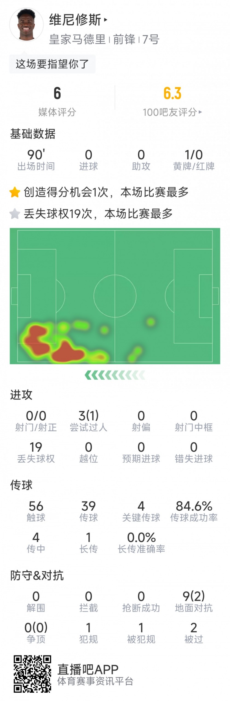 Thống kê của Vinicius trận này: 0 cú sút, 4 đường chuyền then chốt, chỉ thành công 2 trong 9 lần đối đầu
