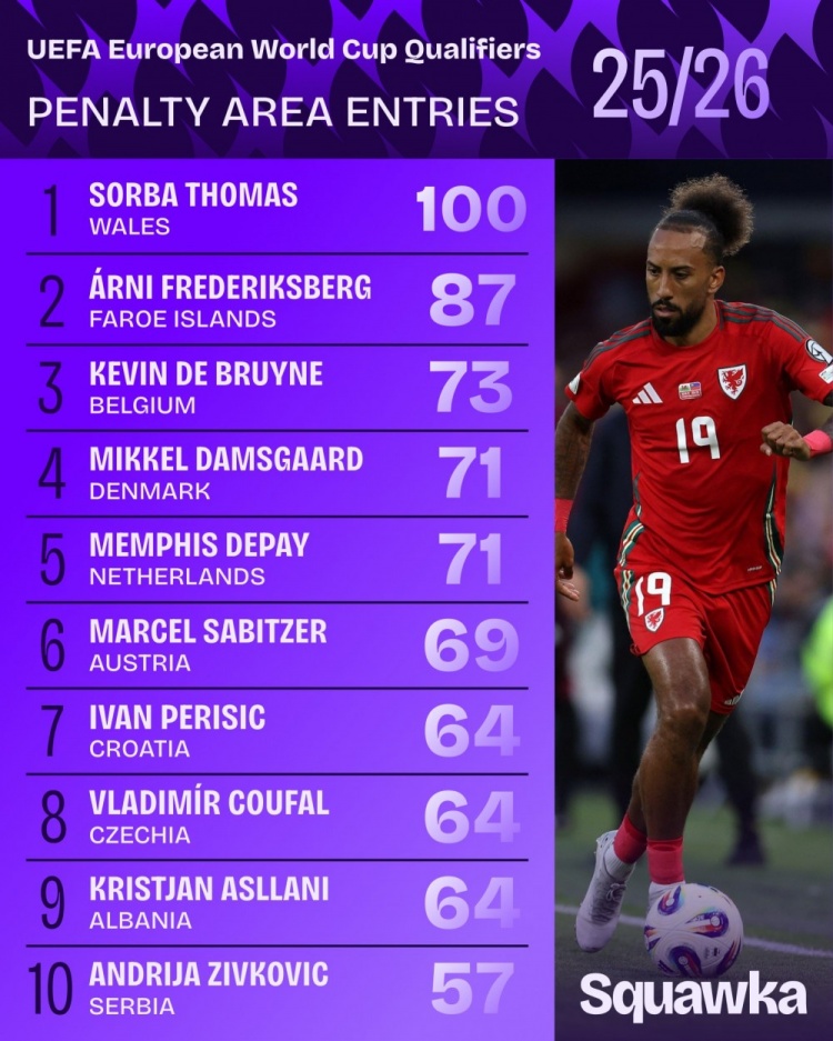 Vòng bảng vòng loại Châu Âu Thế giới này đã kết thúc. Squakwa cũng đếm số lần vào vòng cấm ở giải đấu này, với cầu thủ chạy cánh người xứ Wales Thorba Thomas dẫn đầu.