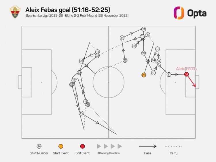 Fabbas trải qua 22 đường chuyền trước khi ghi bàn, đây là đường chuyền phức tạp nhất mà Real Madrid để thủng lưới ở La Liga trong 7 năm qua.